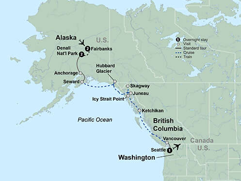Relax for seven nights and enjoy the epic Alaskan scenery from aboard one of Royal Caribbean Cruise Lines’ lovely ships. Cruise through the Inside Passage, taking in rugged natural wonders. Cruise the Sternwheeler Discovery and encounter Alaska’s diverse culture and rich history. Ride the Wilderness Express from Fairbanks to Denali National Park viewing incredible landscapes from glass-domed railcars as guides provide expert commentary. Travel deep into Denali National Park for the best opportunities to view the region’s wildlife. Explore Alaska’s gorgeous capital, Juneau. Visit Ketchikan, the “Salmon Capital of the World.” End in vibrant Seattle with a farewell reception at the Sky View Observatory.